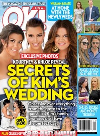 The August 22nd issue of OK! Magazine features Kim Kardashian and they claim they have ‘Secrets of her wedding.’ OK! Magazine seems to in the know about Kim Kardashian and the big event. Last week they had exclusive an exclusive story on what happened inside Kim‘s wedding shower. This week blazoned across the cover is ‘Exclusive Photos – Kourney & Khloe reveal secrets of Kim’s wedding.’