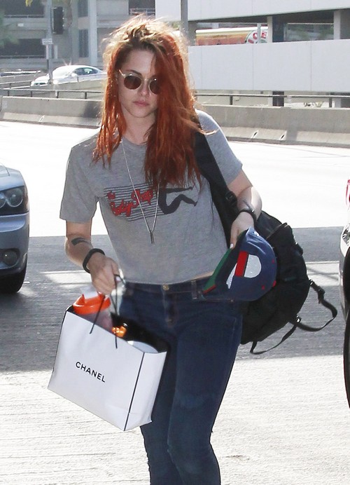 Kristen Stewart departing on a flight at LAX airport in Los Angeles, California with her bodyguard on May 27, 2014. In her new film “The Clouds of Sils Maria.”