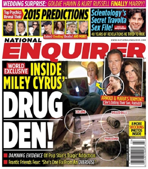 The magazine’s headline reads, “Inside Miley Cyrus’ Drug Den! Damning evidence of pop stars’ tragic addiction.” One line also states that her friends are very worried that she’s “one fix away from an overdose.” Check out the magazine for more details and to see the pictures for yourself. While these photos very well could be a representation of what one might find in Miley’s hazy drug lair, it might be wise to take this report with a small grain of salt. But who knows?