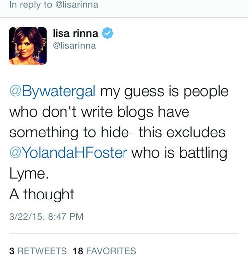 That night of the pain pill was the one night last year; Rinna won’t let it go. Many wonder why she has a dog in the fight. They two actresses are not friends, do not socialize and do not travel in the same circles. But, Richards has been the target of addiction and sobriety gossip by Rinna for months without end. Tonight on Twitter Rinna struck again. A Rinna fan was taking pot shots at RHOBH Kim Richards and again, Rinna engaged with the “troll”, favorited the comment adding a nasty comment at the end before Retweeting. Tonight’s ugliness centers around Kim Richards not submitting an after episode RHOBH Bravo blog after a recent episode and an allegation that Richards doesn’t write her own blogs because she is inebriated or refuses because she has something to hide. Rinna excludes co-star Yolanda Foster who has also not turned in blogs recently. Rinna excuses Foster as she is suffering from a debilitating bout of Lyme’s disease.