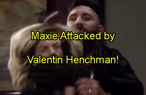 New General Hospital (GH) spoilers from a new video show Maxie Jones (Kirsten Storms) is attacked – this ties back to Valentin Cassadine (James Stuart) and Claudette Bolland (Bree Williamson). Claudette double crossed him and ran with Charlotte West (Scarlett Fernandez) and now Maxie is paying the price.