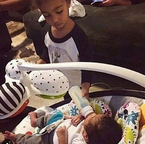 So it looks like daddy, Kanye West is the one who decided that it was time to introduce his son, Saint West to the world. Well, sort of. The photo above shows what looks like North West feeding what we would guess to be her little brother, Saint West a bottle while he sits in his swing.