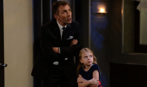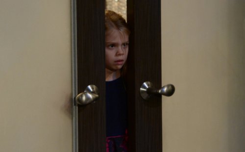 GH spoilers pictures from ABC show Charlotte eavesdropping through a cracked door as the two men fight. Later, Valentin comforts his daughter on the balcony of the hotel as they look skyward. Are they looking up to heaven to talk to her dead non-mother Claudette?