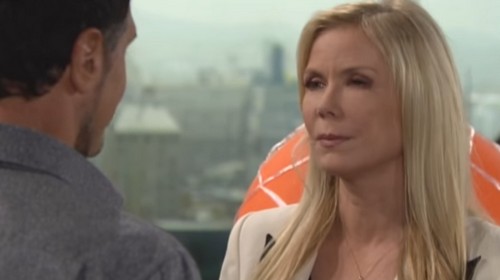 Booze and a broken heart are rarely a good combination. That’s especially true when your marriage broke up because of a dangerous attraction. Let’s say Ridge is throwing back drinks when Quinn (Rena Sofer) finds him. She might offer an apology for her part in their kissing fling.