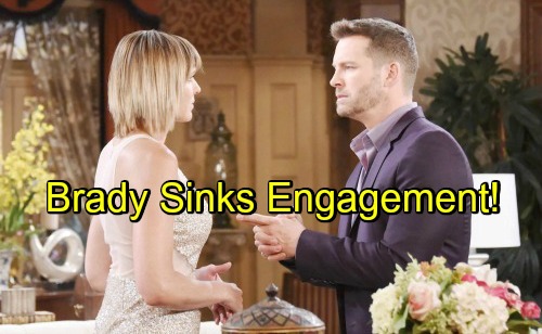 Days of Our Lives spoilers state that Brady (Eric Martsolf) will battle some strong guilt. He’ll start bonding with Eric again, which could put Jennifer’s future with him in jeopardy. Brady will be tempted to blab about blackmailing Nicole over Deimos’ (Vincent Irizarry) murder.
