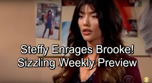 However, Steffy (Jacqueline MacInnes Wood) will remain furious over Brooke’s betrayal. Brooke won’t be too happy with Steffy for spilling the news either! The Bold and the Beautiful spoilers say they’ll clash over which man has Brooke’s heart. She’ll promise she doesn’t have feelings for Bill, but Steffy will think that kiss suggested otherwise.