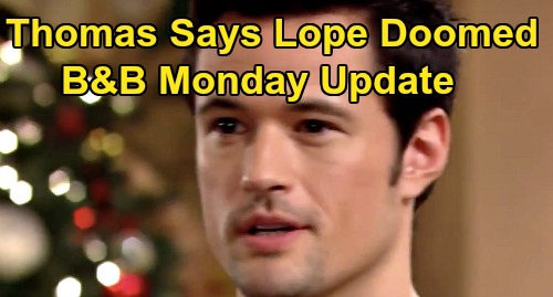 The Bold and the Beautiful (B&B) spoilers update for Monday, December 23, teases that Thomas Forrester (Matthew Atkinson) will pat himself on the back. He’ll think everything’s lining up perfectly in his quest for Hope Logan’s (Annika Noelle) heart. Thomas knows he has to handle each step of his plot carefully, but he’s managed to pull off most of what he wants so far.