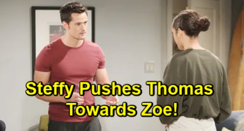 Will Steffy try to nudge Thomas in Zoe’s direction? She might decide to put Zoe back to work on some hot new lines and keep her close to Thomas. Steffy might feel like if Thomas falls for someone new, he’ll forget about Hope and her adoption scheme. She’ll suspect Hope’s manipulating Thomas, but she may think Zoe’s interest in him is genuine. Zoe would be the clear winner in Steffy’s book.