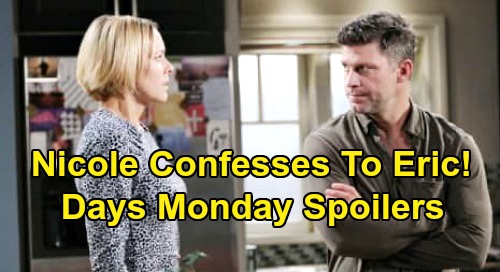 After Eric assures Nicole that they can tackle anything together, he’ll beg her to let him in. Eric’s afraid Nicole might be sick, so the truth’s going to leave him floored. Days spoilers say Nicole will confess how she came to suspect Mickey was actually Rachel DiMera Black. Once Nicole relays the story she got from Dr. Raynor (Victoria Platt), an emotional Eric will try to wrap his head around it.