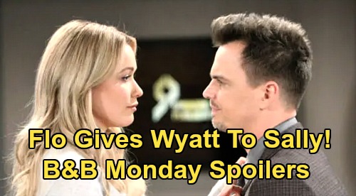 As B&B viewers know, Wyatt has just told Flo all about Sally Spectra’s (Courtney Hope) terminal condition, and Flo has just told Wyatt that he knows what he needs to do.