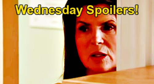 B&B spoilers say Sheila will spy on Deacon and Taylor as the session wraps up, so she’ll glare with jealousy as she watches them share a warm embrace.